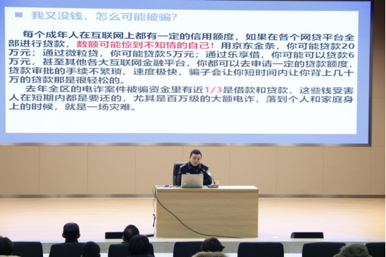 劉非凡結合一線反詐實戰經驗,以真實案例與數據為引,深入剖析了當前電信網絡詐騙的嚴峻形勢與複雜手法。他聚焦校園高發騙局,通過講解學生購買演唱會門票被騙、輕信“代發論文”信息遭受損失、畢業生陷入虛假試崗陷阱等多起發生在師生身邊的真實事件,以及針對退休教師、高校教師的冒充公檢法、虛假投資理财等典型騙局,生動揭示了詐騙手段的多樣性與隐蔽性,以及給受害者帶來的嚴重财産與精神損害。在防範應對方面,劉警官給出了具體實用的建議,包括警惕可疑投資APP、拒接境外可疑來電、牢記“四不”防騙口訣,并強調了遭遇詐騙後第一時間報警并保存證據的重要性。鮮活的案例直擊人心,同學們聚精會神、認真聽講,對詐騙的隐蔽性與危害性有了更為切身的警醒。